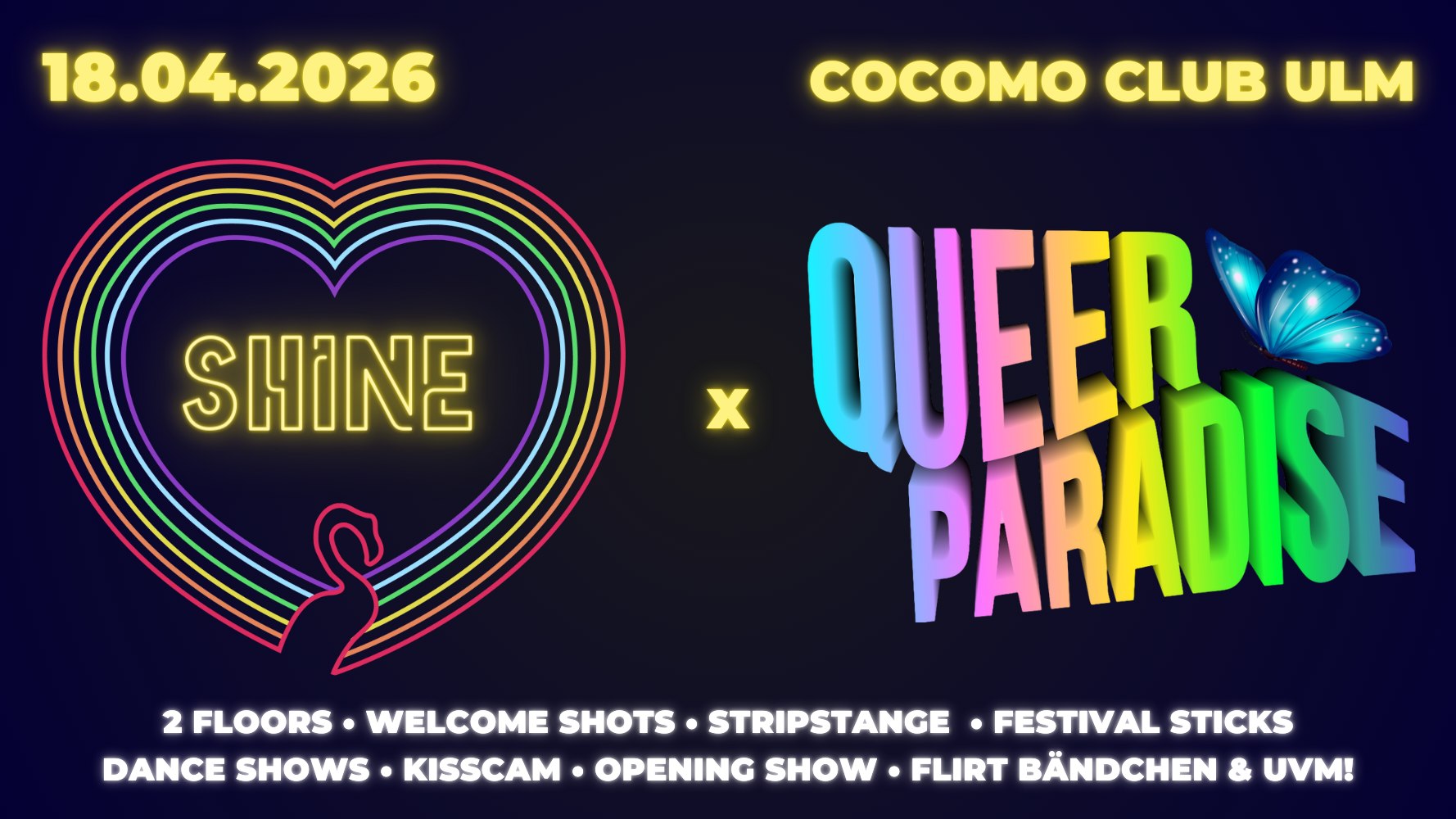 SHINE x QUEER PARADISE: Gemeinsam mit Joely White & seinem Team bündeln wir die Kräfte und veranstalten ein gemeinsames Event. Dabei könnt ihr viele Specials erwarten wie Dance Shows, Flirt Bändchen, Musik auf 2 Floors und vieles mehr!